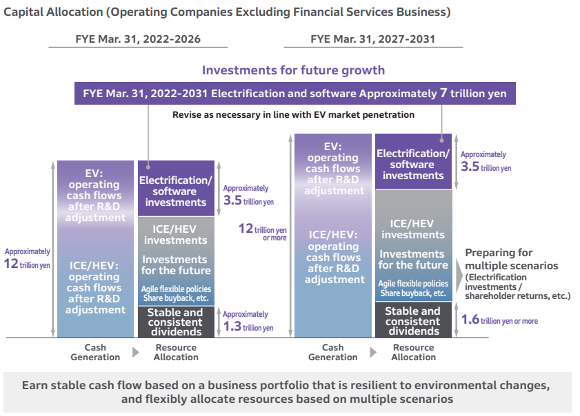Looking ahead to the Fiscal Years Ending March 31, 2031, we will use cash generated primarily from the motorcycle business, four-wheel ICE/HEVs, and the financial services business to support shareholder returns, resource allocation to electrification and software, and research and development of new businesses for the future. In the longer term, through the four-wheel electrification strategy, we will build a business structure capable of generating earnings with EVs, further enhancing our company-wide cash generation capability.